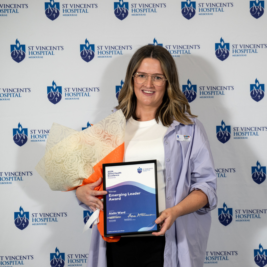St Vincent’s Allied Health Excellence Awards highlight patient care, innovation and leadership You are here:HomeNewsroomNews Pictured: St Vincent's Hospital Melbourne Chief Executive Nicole Tweddle, Allied Health Excellence Award winners Jess Esposito, Rachel Robinson, Nga Tran, Naomi Parkes, Aislin Ward and Kim Lunardi, and Chief Allied Health Officer Fiona McKinnon. St Vincent’s Hospital Melbourne has honoured its 2024 Allied Health Excellence Awards winners, recognising the pivotal role allied health professionals play in delivering high-quality, multidisciplinary care. With over 60 nominations from more than 500 allied health employees, the awards highlighted the exceptional contributions of individuals and teams across six categories. The recognition underscores the vital work done by allied health in areas such as clinical practice, research, leadership and training. In her opening address, Chief Allied Health Officer Fiona McKinnon reflected on what it takes to be a strong allied health practitioner. She noted that in addition to being excellent problem-solvers, allied health professionals “are also great communicators and exceptionally skilled at building relationships, especially that all-important rapport with patients.” Teams and individual were recognised for their dedication and innovation over the past year, and for their continued efforts to deliver better and fairer care, always. Chief Allied Health Officer Leadership and Excellence Award - Naomi Parkes, Occupational Therapist Discipline Lead for Mental Health and OT Educator Naomi is known for her exceptional leadership and commitment to excellence. She fosters a supportive environment, ensuring staff receive guidance through supervision, placements and training. Her inclusive approach boosts team morale and enhances the overall quality of care. Clinical Excellence Award - Nga Tran, Senior Pharmacist Nga is a dedicated leader in mental health pharmacy, spearheading initiatives to improve patient outcomes and safety. Her contributions and tenacity were cental to establishing the mental health pharmacy service. Emerging Leader Award - Aislin Ward, Senior Clinician, St Georges Occupational Therapy and Michael Jovanovic, Procurement, Formulary and Finance Pharmacist Aislin has an exceptional ability to drive innovation and make impactful contributions across both the multidisciplinary team and Occupational Therapy at St George’s Health Service in Kew. She consistently exceeds the expectations of her role, demonstrating leadership and vision. Michael is a kind, compassionate and inclusive leader who fosters a collaborative, equitable environment in the pharmacy department. His open-door policy and commitment to ensuring all voices are heard empowers team members to thrive. Excellence in Innovation and Improvement Award - Kim Lunardi, Senior Dietitian, Advanced Practice Gastrostomy Credentialed Dietitian Kim has been a pioneer in gastrostomy tube management. She successfully led the ‘Strengthening the Gastrostomy Feeding Tube Advanced Practice Workforce Across Victoria’ initiative, significantly improving accessibility and care for patients. Early Career Award - Jessica Esposito, Occupational Therapist and Rachel J Robinson, Grade 2 Subacute Speech Pathologist Jess (left) has excelled as a new graduate occupational therapist, demonstrating exceptional care, enthusiasm and collaboration. She goes above and beyond in her work, advocating for consumers and developing recovery-focused activities. Rachel (right) has quickly grown from new graduate to early grade 2 clinician, demonstrating emotional maturity, clinical excellence and a strong commitment to patient care. Her compassion, dedication and advocacy for vulnerable populations reflect St Vincent’s core values. Excellence in Clinical Supervision and Education Award - Andrea de Rauch, Grade 3 Prosthetist/Orthotist Andrea, who was unable to attend the event, has been instrumental in establishing and facilitating the Prosthetics and Orthotics department’s revitalised clinical supervision program. Andrea has worked tirelessly to develop, educate and build the capabilities of the team.