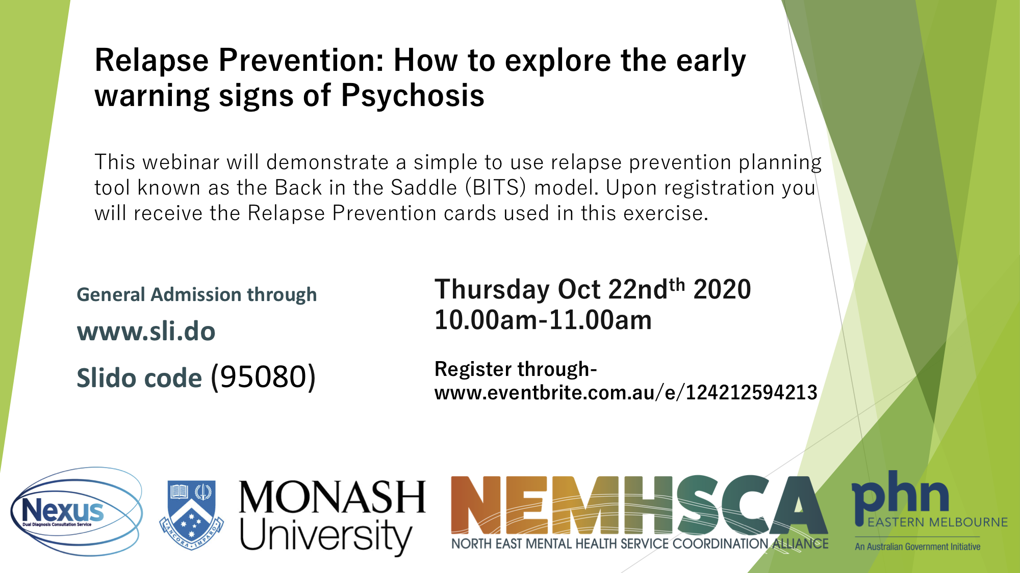 Relapse prevention planning is an important element of mental health care and recovery. But how do you do it? This webinar will demonstrate a simple to use relapse prevention planning tool known as the Back in the Saddle (BITS) model. The webinar will be followed by a live Q&A and is open to the public. Upon registration you will receive links to the Relapse Prevention cards and link to the journal article. This webinar is a collaboration with Monash University, Nexus Dual Diagnosis Consultation service and NEMHSCA.